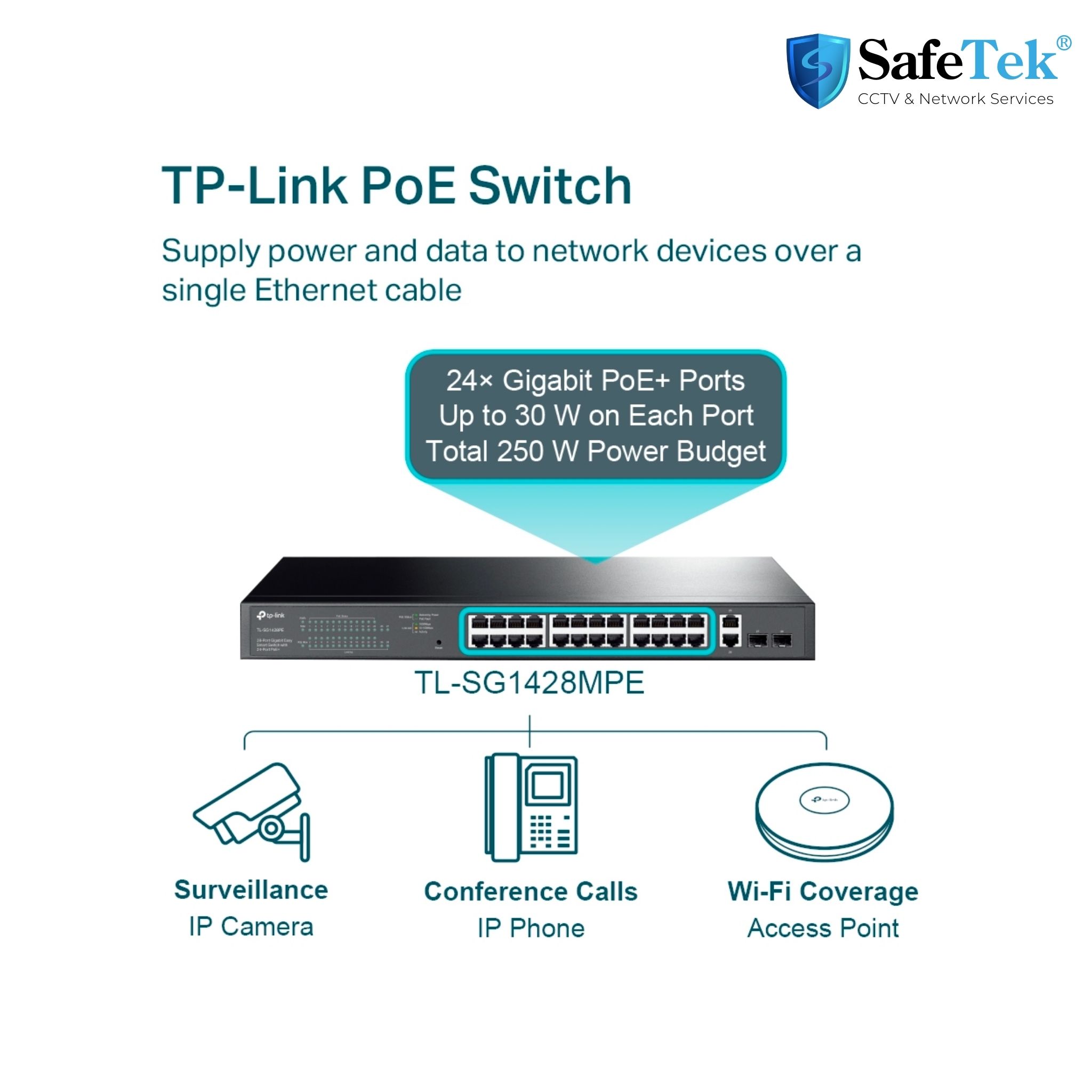 • PORT: 24× Gigabit PoE+ Ports, 2× Gigabit Non-PoE Ports, 2× Gigabit SFP Slots